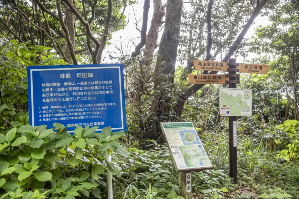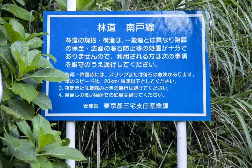 三宅島の林道はかなり看板類がしっかり設置されていて、どれも風化されておらず綺麗で読みやすいです。注意事項はこんな感じ。どこも共通しているのは、道幅がかなり狭くて、見通しが悪いんです。さらに舗装されていても枝や落ち葉、石などで荒れていることが多いので、速度にはかなり注意しましょう〜。