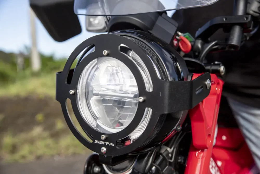 前から飛んできた小石などでヘッドライトが割れるのを予防するガードです。黒いフレームの中心には円の形をした透明な板が入っています。透明なのでヘッドライトの明るさにも大きな影響はありません。