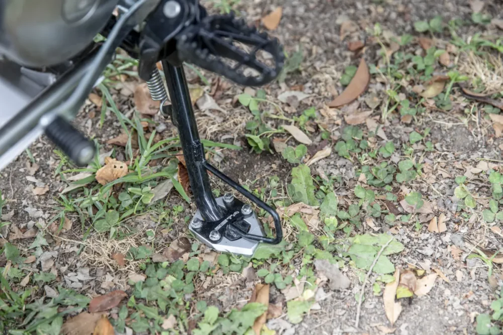 キャンプ場とか公園とか駐車場とかで、サイドスタンドをかけたらバイクの重さで土に埋まってしまって立ちゴケしそうになったことはありませんか? それを防いでくれるのが、このサイドスタンドエクステンダー。広い面積で土を受け止めることでバイクの重さを分散し、スタンドが沈みにくくなっています。はっきり言ってこれも林道では必須です。特に三宅島のスコリアなんて、一番これが必要なやつですね。