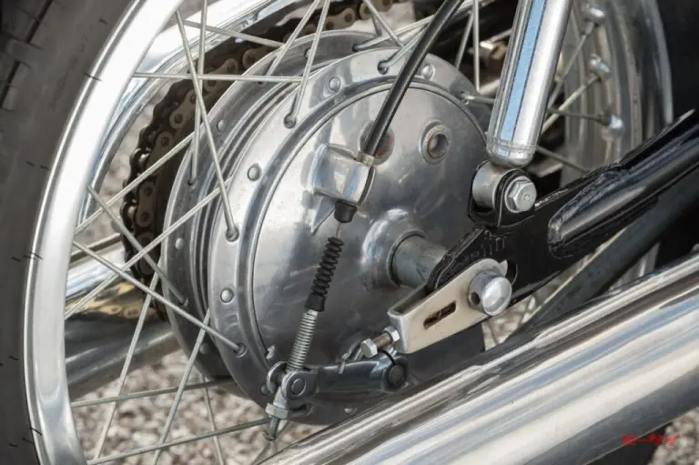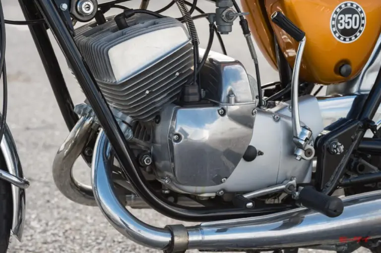 前述の100マイル巡航を満たすべく、車体は高速直進安定性を意識したのだろう。同車のキャスター角は当時の車両で標準的ながら、トレールと軸距は350ccクラスでは長めの部類。それが前述の印象につながっているのだが、かといって重ったるいわけではない。カッチリしていると言った表現が適切で、それはコーナリング時や切り返し時も同様だ。
