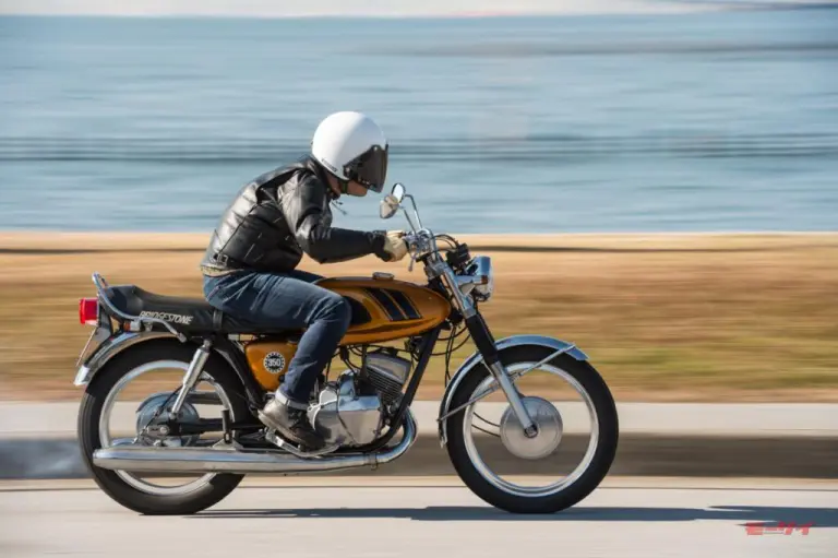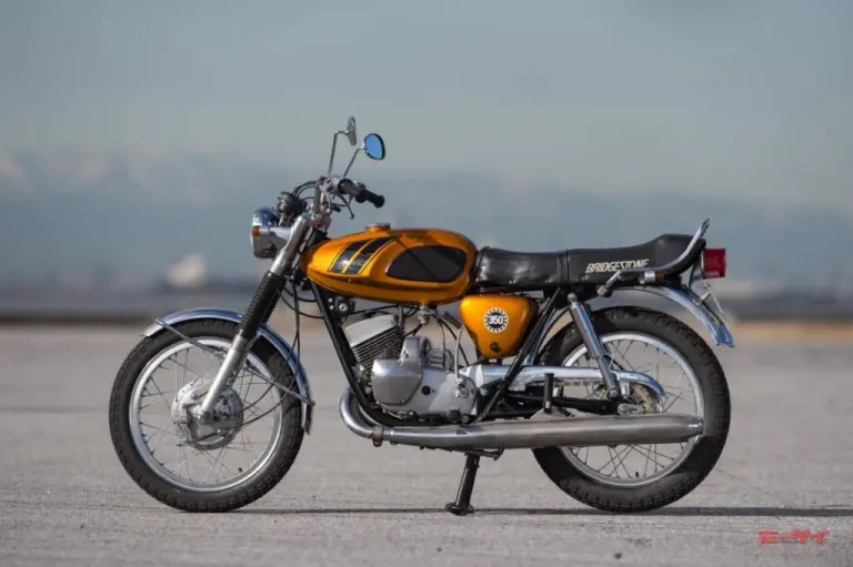 ブリヂストン(以下BS)と言えば、だれもが知る世界的なタイヤメーカーだが、1950年代から60年代にかけて、BSのサイクル部門(現ブリヂストンサイクル・自転車などを製造)は有力なオートバイメーカーだった。ただし、当時の大手4社(ホンダ、ヤマハ、スズキ、カワサキ)のような多機種展開をできる規模ではなかったため、後々の業績悪化への懸念もあったほか、本業のタイヤ製造に専心する意図からも、BSは1971年にモーターサイクル事業から完全に撤退することになる。そして、1967年に発表された輸出専用の350cc空冷2ストツイン350GTRは、同社の最後を飾るモデルとなった。