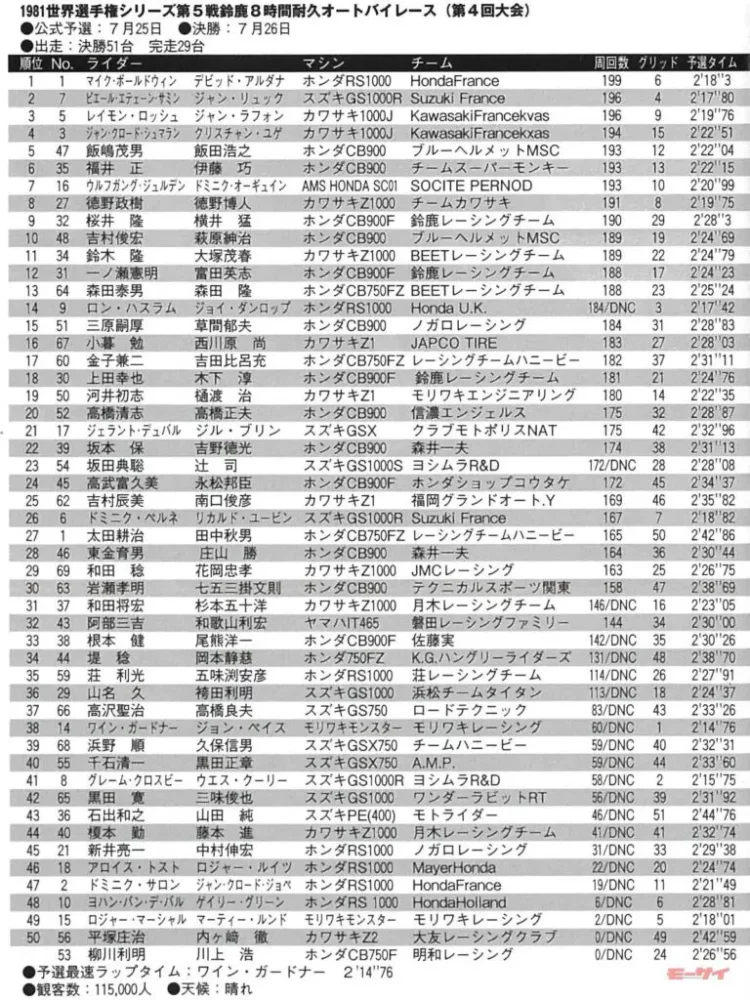 これに続く2位のピエール・エティエンヌ・サミン/ジャン・リュックはフランススズキ、3位のレイモン・ロッシュ/ジャン・ラフォンと4位のジャン・クロード・シュマラン/クリスチャン・ユゲはフランスカワサキからのエントリーで、結果的にこの年の鈴鹿8耐では、世界選手権シリーズを戦う本場の耐久ライダーがきっちりポイントを獲得したのだ。その一方でセンセーショナルなデビューを飾ったガードナーが、後にホンダファクトリーに抜擢されたのも見逃せない話題だろう。