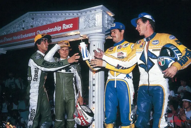 ■表彰台でお互いを祝福する耐久のスペシャリストは、左からパトリック・イゴア(84年にホンダに移籍して世界耐久3連覇を達成)、 ジャン・ラフォン(81年の耐久チャンピオン)、 エルブ・モアノー (ホンダ RS1000を駆った81年に初代耐久王座を獲得)、 リカルド ・ユービン(カワサキからスズキに移籍してからはモアノーと共に耐久のエースを務めた)。この中ではユービンだけがベルギー人で、ほか3人はフランス人だ。
