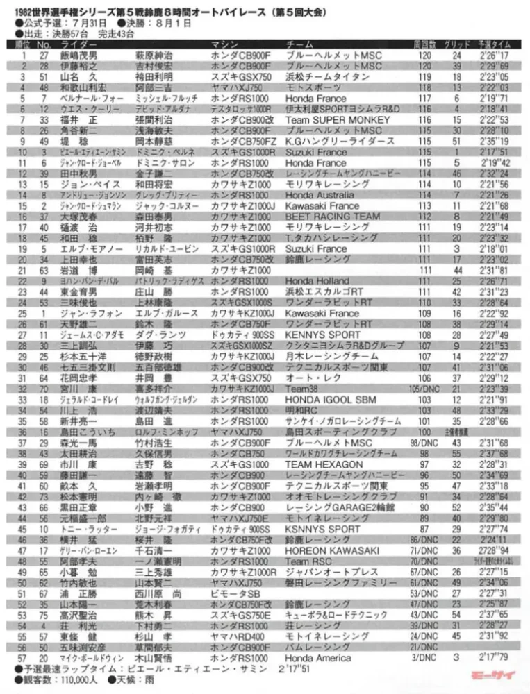 最初の犠牲になったのは、78/81年に優勝を飾っているホンダフランスのマイク・ボールドウィンで、以後、ヨシムラスズキのデビッド・アルダナ、カワサキフランスのジャン・クロード・シュマランといったベテラン勢も、次々と豪雨の餌食になっていく(前年の鈴鹿8耐を盛り上げたガードナーとクロスビーは、この年は不参加)。アメリカやヨーロッパでは、これほどの悪天候でレースを行うことはあり得ないのだから、それは当然のことであり、外国人ライダーの多くは借りてきた猫のような走りに徹することとなってしまった。