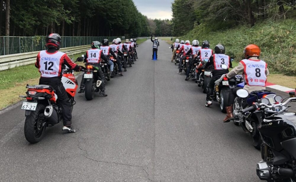 大手チェーン「レッドバロン」が運営するバイク専用コース「那須モータースポーツランド」で開催されます。基本のパイロン練習からサーキットコースでの実践走行までを1日で段階的に学べます。特徴的なのは「雨天決行」の方針で、濡れた路面での走行こそ高度な技術習得の機会と捉えています。レッドバロン会員は参加料が割引になりますが、車両はレンタルではなく持ち込み(126cc以上)が基本となります。