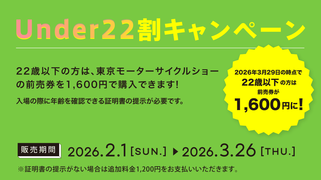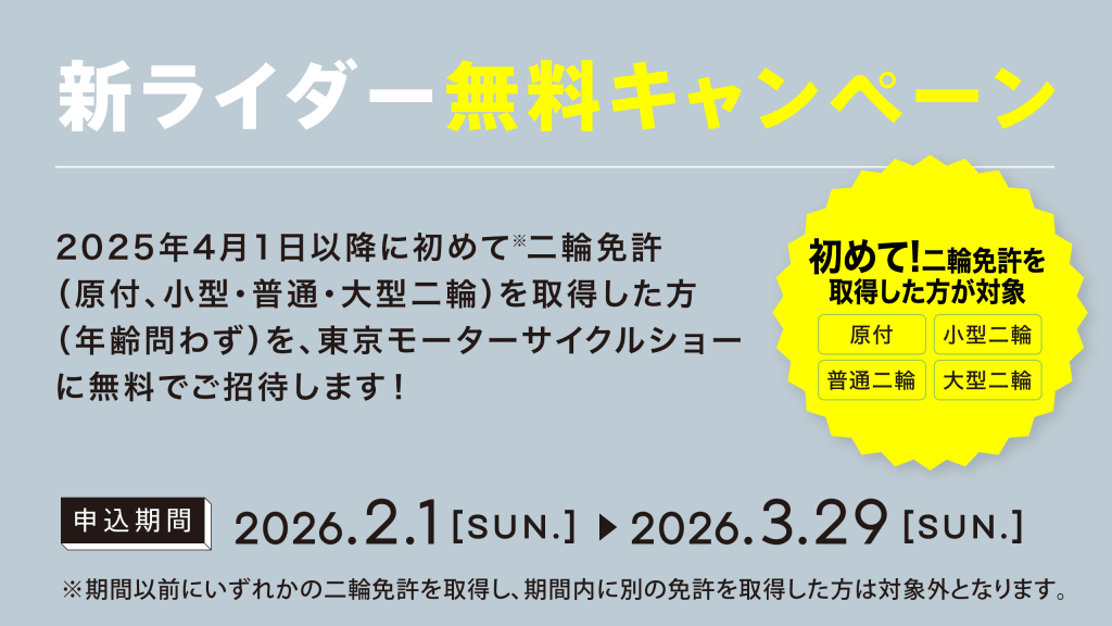入場券は「Under22割引」やグッズ付きチケットなど、選べる区分を用意。「新ライダー無料キャンペーン」では、2025年4月1日以降に初めて二輪免許(原付、小型・普通・大型二輪)を取得した方は年齢を問わず無料で入場できます。さらに、高校生以下も入場無料(高校生は公式サイトで事前登録必要、中学生は入場の際に学生証提示が必要、小学生以下は保護者同伴)なので、バイクにちょっと興味がある方は気軽に立ち寄ることができます。ペア割もあるため、家族や友人、バイクに詳しくない同行者も一緒に楽しめるのもポイント。
