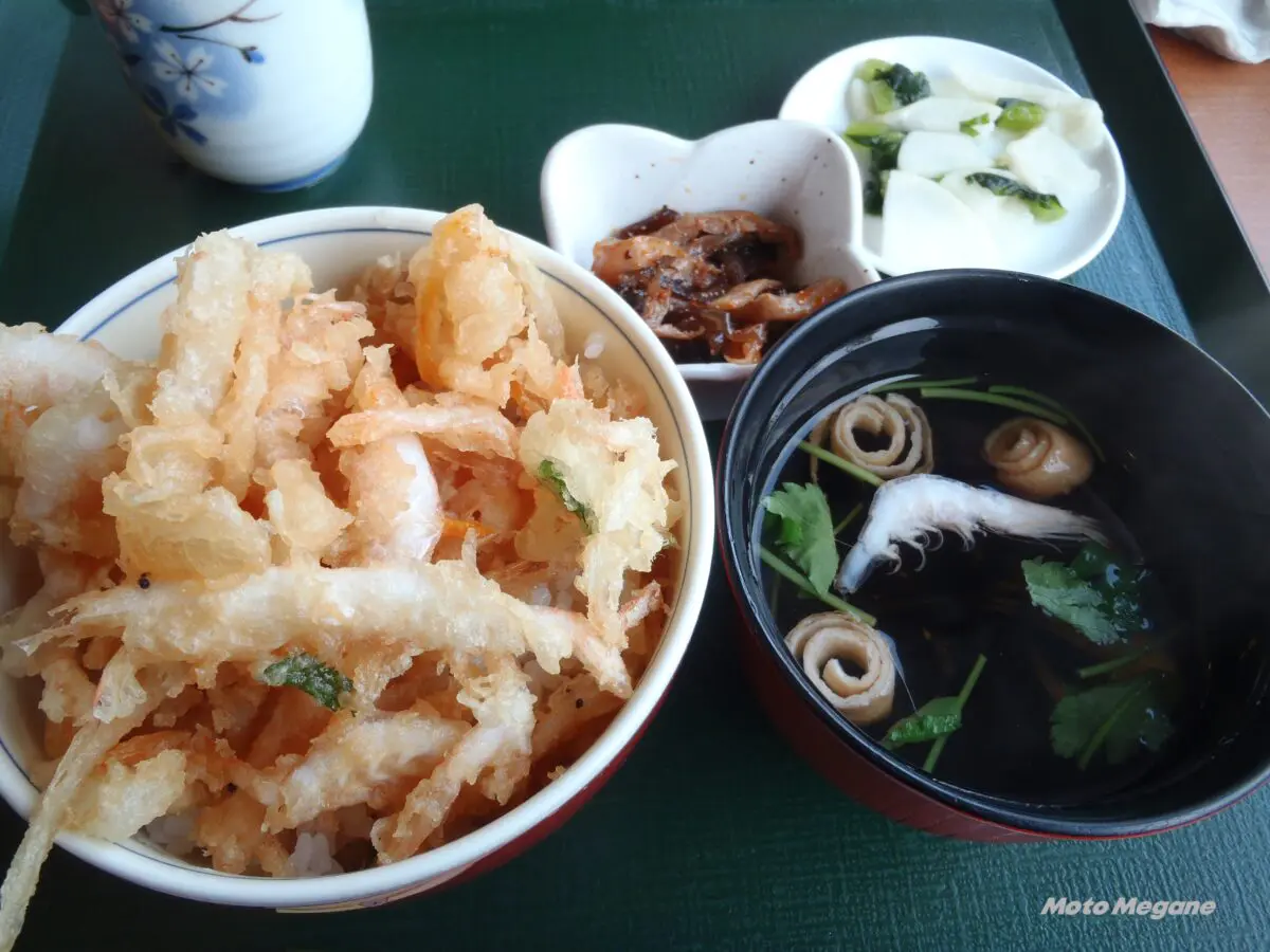 全国ご当地どんぶり選手権でグランプリを獲ったことがある「白エビかき揚げ丼」は、レストラン1番人気のメニュー。特産の白海老と香味野菜で揚げた、サクサクの白海老のかき揚げがご飯にのった、ボリューム満点の丼。