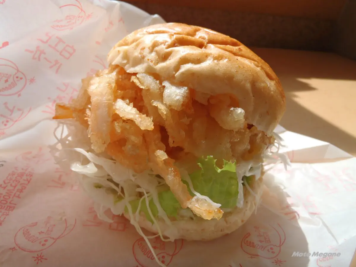 ご当地バーガーの代表格、元祖白エビバーガー。多数のTV番組で取り上げられた有名B級グルメでもある。バンズには、白エビのかき揚と自家製タルタルソースが挟まっている。サクサクのかき揚げとタルタルソースが相性抜群だ。