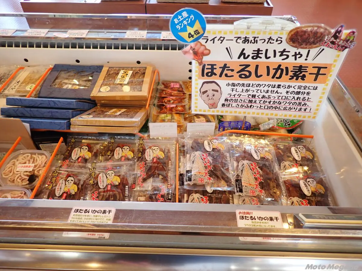 物産販売コーナーでは、白エビを使ったさまざまな商品を販売。冷蔵品から、せんべいなどの土産品まで種類が豊富。白エビ以外にも富山湾名物のホタルイカ商品や、海産物を中心に富山県や地元の特産品、道の駅オリジナル商品などが数多く揃う。