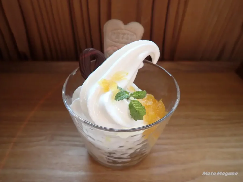 生乳ソフトクリームに季節のジャムをトッピングしたサンデー。ジャムは地元の食材を使った食堂のお手製。ジャムとミルクソフトのマリアージュを楽しめる。ジャムの種類は季節によって変わるので、行く度にいろいろな味を楽しめる。