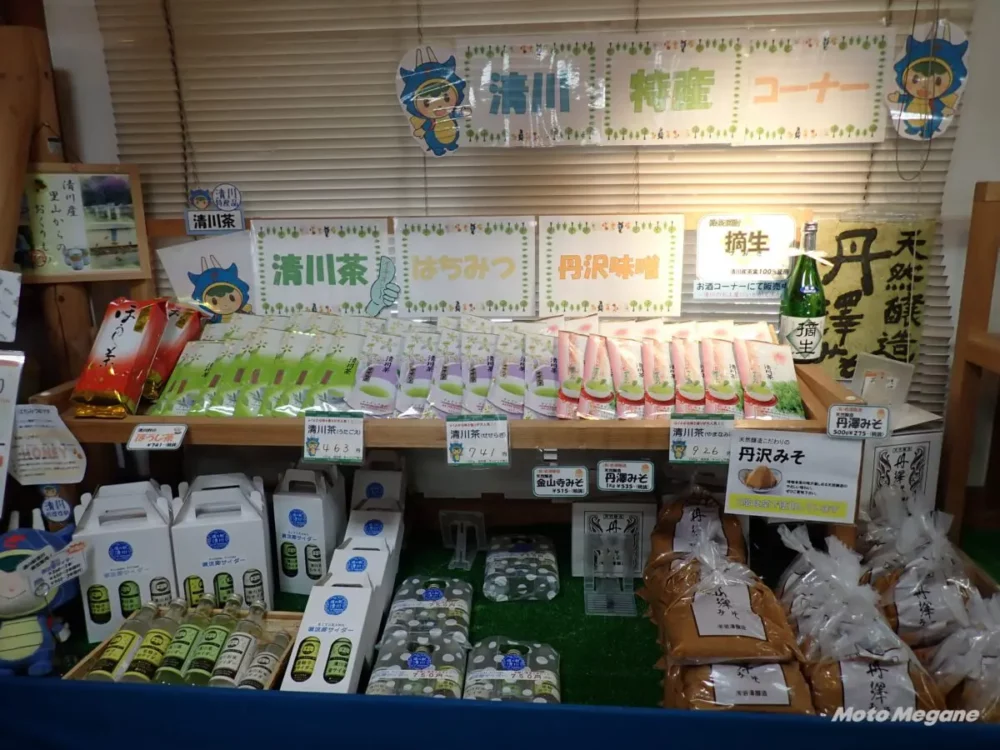 瓦屋根の古民家風の駅舎には、特産品販売所、食堂、工芸品コーナー、休憩室が入る。直売コーナーには地元産の季節の新鮮野菜が数多く並び、丹沢味噌、自然薯、お茶やハチミツなどの特産品も豊富に揃う。村にあるベーカリーのパンなど、清川グルメも目白押し。森に囲まれた清川村では製材業が盛んで、道の駅でも国産の木材を使った木工品などを販売している。地場野菜を目当てに道の駅に訪れる人も多いという。道の駅で購入した野菜や肉は、近隣にある「アグリパーク伊勢原」に持ち込んでBBQをすることもできる。