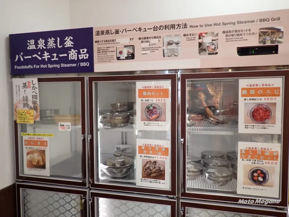 噴火湾産のカキやホタテ、甘エビなどの魚介類、定番のタマゴ、まんじゅうのほか、ジンギスカンや豚肉と野菜のセットなどの肉類も用意されている。食材は季節によって変わるので、季節ごとにさまざまな食材を楽しめる。