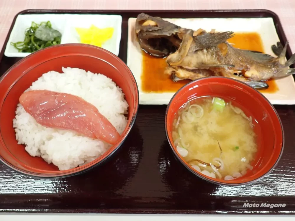食堂の一番人気は、特産品の鹿部たらこを1本どーんとのせたご飯と、その日水揚げされた地魚の煮付けのセット。煮魚は注文を受けてから炊き上げてくれる。お米はブランド米の「ふっくりんこ」を使用。地元海鮮の味噌汁付き。