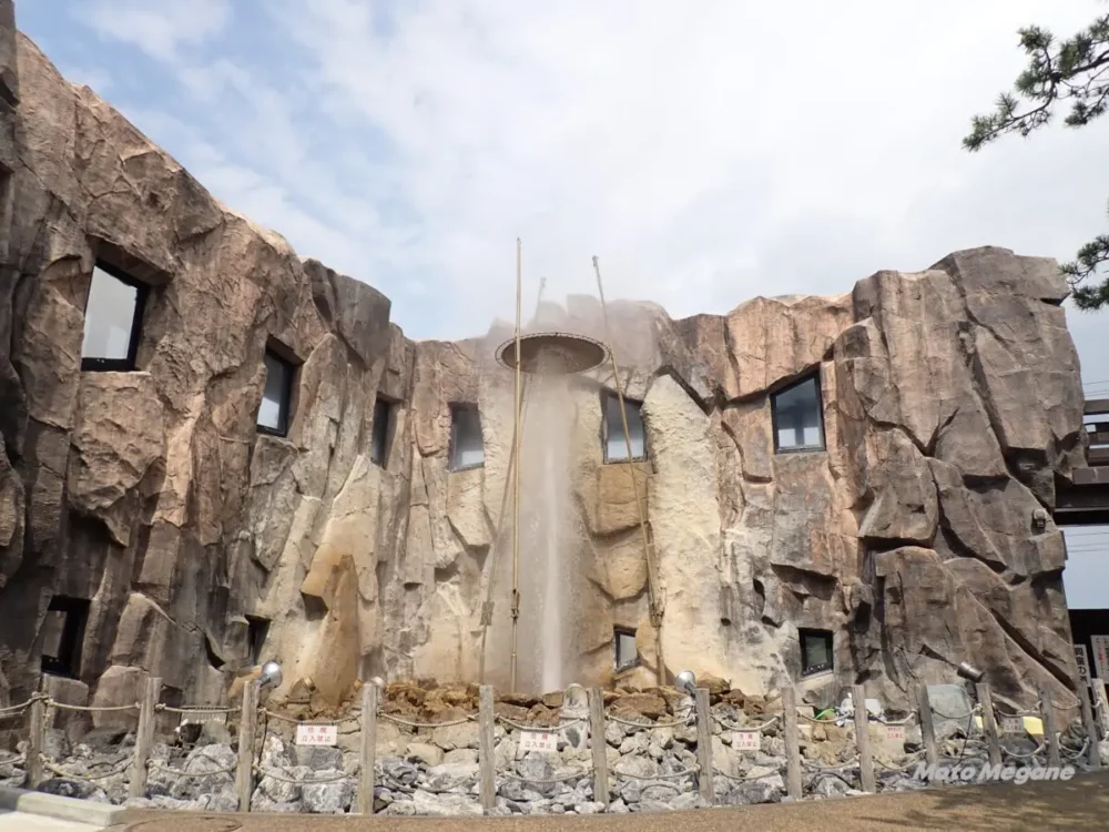 間歇泉は駅併設の間欠泉公園で見ることができる。約100℃の温泉が高さ約15mまで自然の力で噴き上がり、間近で観ると大迫力だ。園内には間歇泉の温泉を利用した足湯も設置されている。