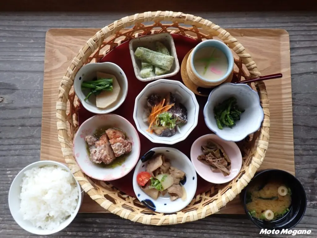 四万十の食材を使った料理を小鉢に盛り付けた「十和かご膳」。四季の旬の食材を使用し、内容は季節ごとに変わる。郷土料理の原木椎茸のたたき、四万十ポーク、四万十町産卵の茶碗蒸しなど、地産地消の料理となっている。「十和」にちなんで10種の料理が楽しめる。