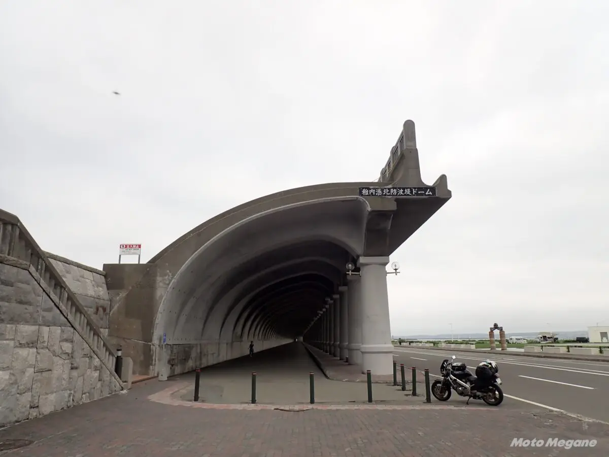 平成13年(2001)に北海道遺産に指定された、全長427m、高さ13.6mの半アーチ型の防波堤。70本の円柱が連なり、古代ローマ建築の回廊を思わせる雰囲気で、写真の撮影スポッとしても人気の場所。なだらかな曲線を描いた回廊は、世界でも類をみない建築物。道の駅からは徒歩3分ほど。
