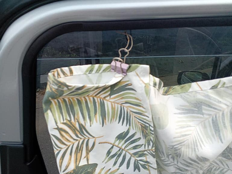 完全に内部が見えなくなるようにしている人もいますが、私は車内に人がいるかどうか外から分かるようにしたいので、後部のドアにだけシェードを付けています。