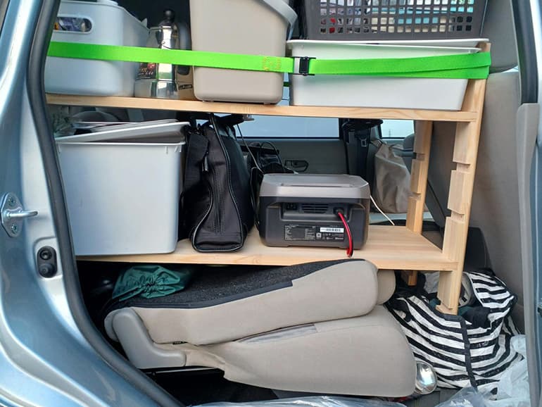筆者の場合、簡単な調理器具とポータブル電源、布団やDIYした棚とテーブルだけでも6カ月間、車上生活ができました。