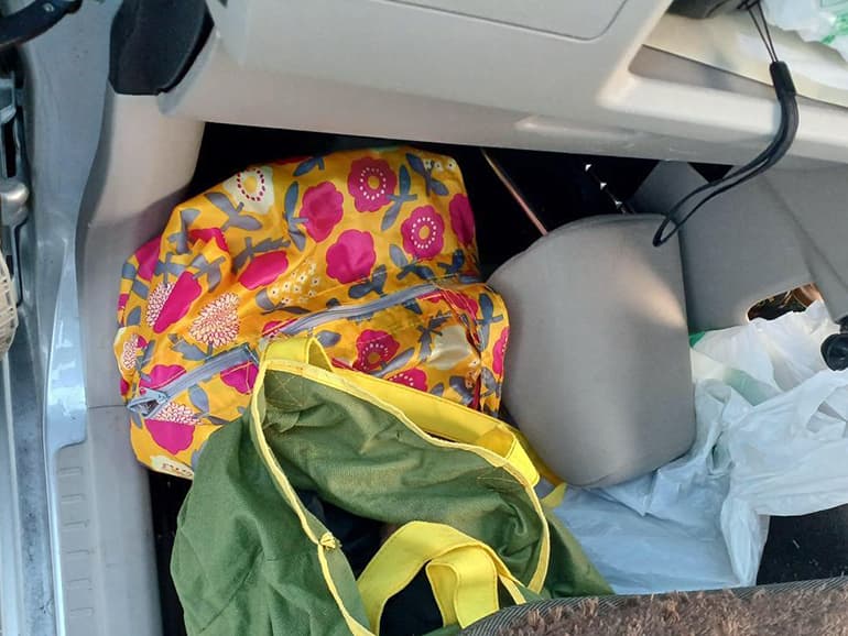 棚に載せきれない物は後部座席や助手席側の足元のスペースに置いています。