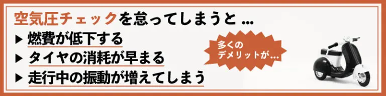 タイヤの空気圧が低下した状態ではバイクの燃費も低下しますので、経済的にも影響があります。