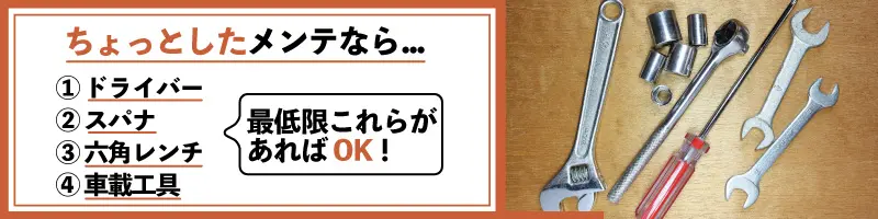 最初は基本的な工具から揃えて慣れていくごとに上級の工具類を揃えていけばよいので、まずは簡単なメンテナンスから始めると良いでしょう。