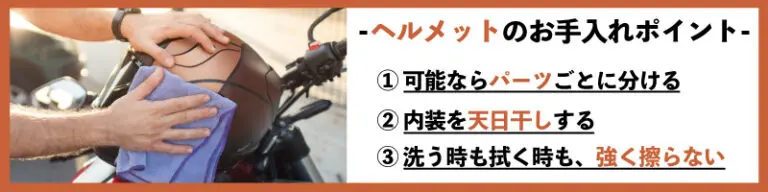 バイクの車体をベストな機関コンディションで乗ることはもちろん大事ですが、万が一のためにライダーを事故・ケガなどから守ってくれるヘルメットなどのメンテナンスもおこない、次回のライディングに備えることも大事です。