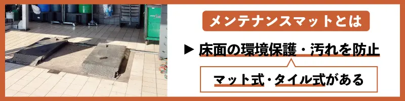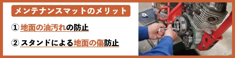 オイル交換などのメンテナンス作業では、地面の油汚れの防止対策にメンテナンスマットが役立ちます。