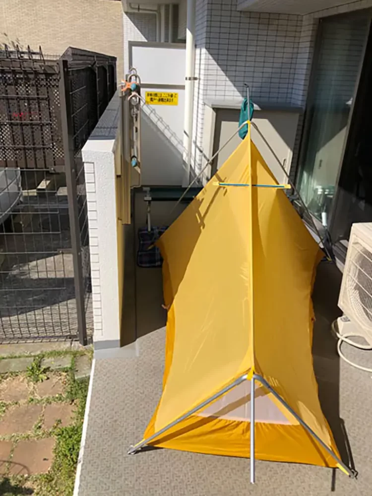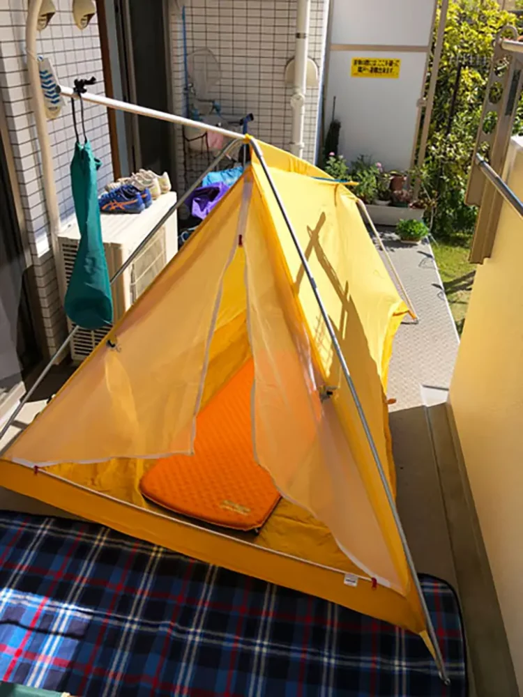 マンションの庭にソロテントを設営! ペグダウンはできないのでスペースに合ったサイズの自立式テントがベター。また、煙の出る焚火など集合住宅地では基本NG、調理などは自宅のキッチンをつかうようにしましょう。消防法やマンション規約に触れないよう、あくまでも自己責任でお願いします!