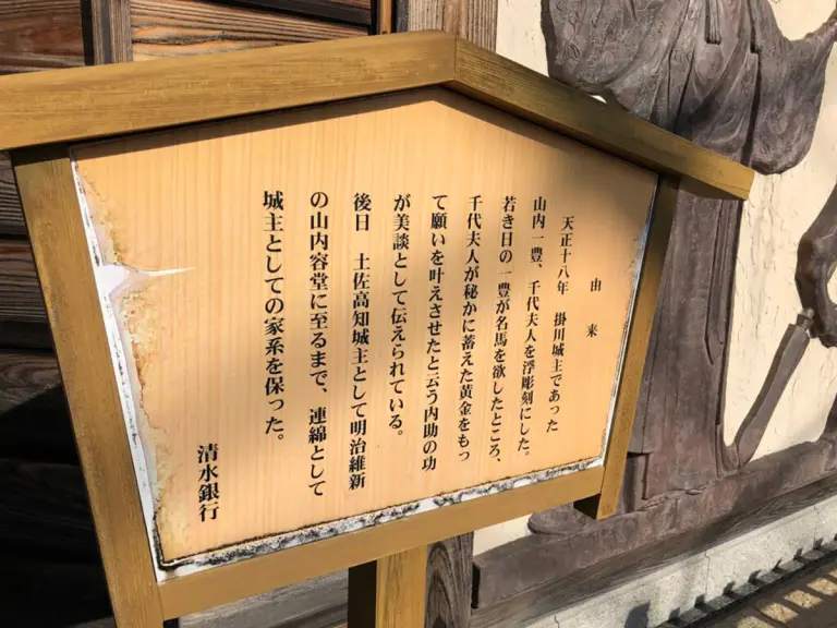 そして天浜線沿いには前編でも案内しましたが、大河ドラマの舞台が多数あります。ここ掛川も2006年の大河ドラマ「功名が辻」の舞台となっており、戦国武将の山内一豊と妻の千代にまつわるものが街のあちこちにあります。
