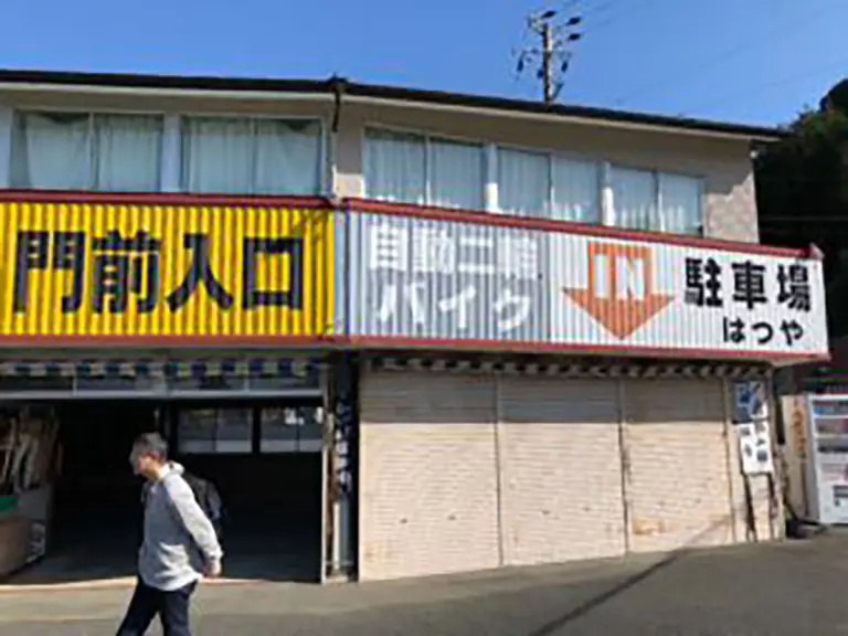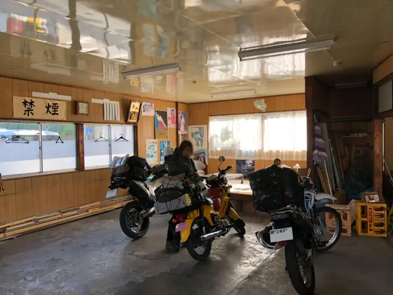 1日200円でバイクを屋内保管してくれて、ヘルメットや荷物も置いて行ってOK。奥に見える座敷で休憩もOKよ! と優しいおばちゃんが素敵。
