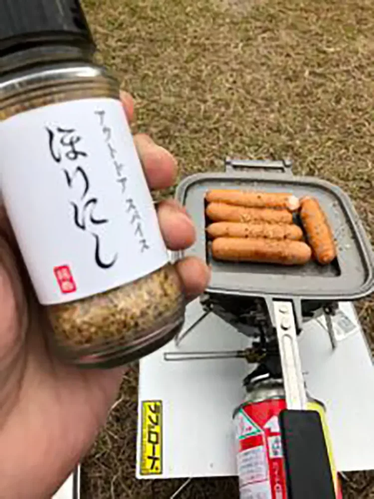 皆さまイソイソと撤収準備してますがワタクシこれから朝食準備♪ 先日佐渡ツーの帰りにGETしたTSBBQホットサンドメーカーと、アウトドアスパイス「ほりにし」でまずはウインナーから♡