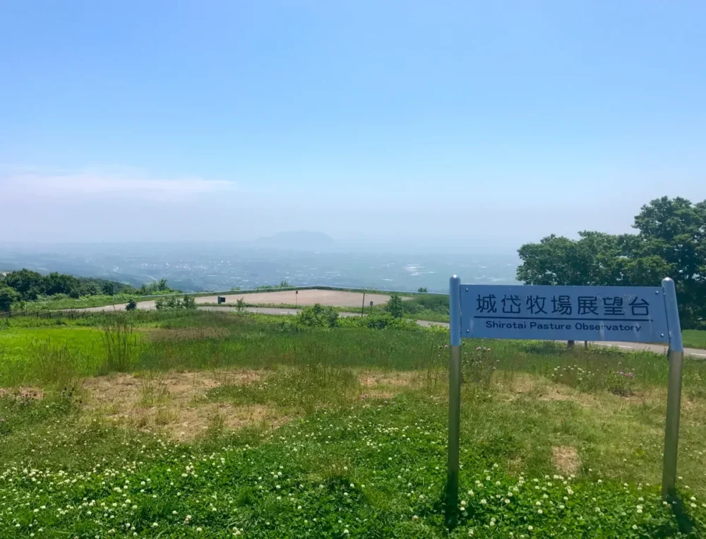 城岱牧場展望台は北に駒ヶ岳、それから南に函館山を望める絶景スポットで、綺麗な駐車場とトイレ完備の無料休憩所が設置されています。