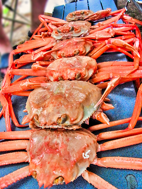 7軒あまり並ぶ店は、いずれも自前の船を持って漁を行い、そのまま店に並べるので、とびきり新鮮なズワイガニが味わえます。値段もリーズナブルで、茹でたてのズワイガニをそのまま表に並ぶテーブルに座って、素手でムシャムシャと。日本海の海の香が口の中いっぱいに広がって、朝から至福が味わえます。