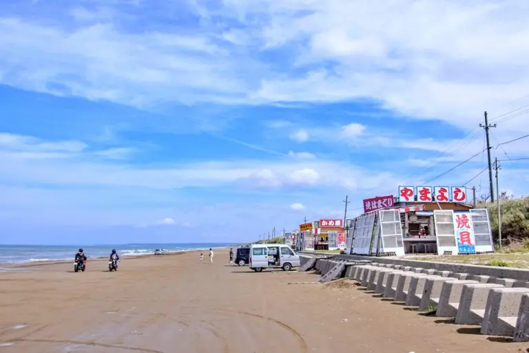 その千里浜の羽咋市終点に位置するあたりには、5月の連休から11月頃にかけて昔懐かしい浜茶屋が並びます。白貝の貝焼きをはじめ、ハマグリ、サザ工、イ力焼きなど、広い砂浜に香ばしい香りが漂って、ついついふらふらと。なにやらビールでもといきたくなってしまいますが、そこはぐっとこらえてノンアルコールで、朝からちょっといい気分に。8時過ぎくらいからぼちぼちと開いていくアバウトさが、またローカル色豊かで和みます。