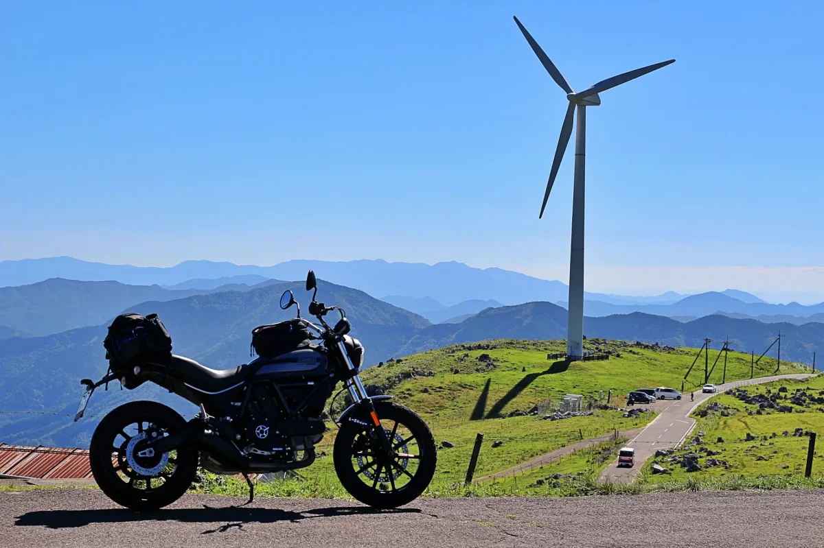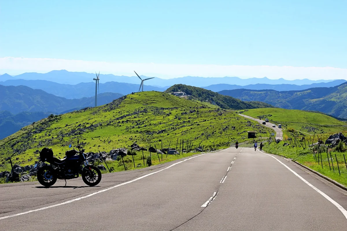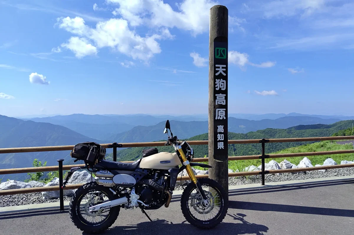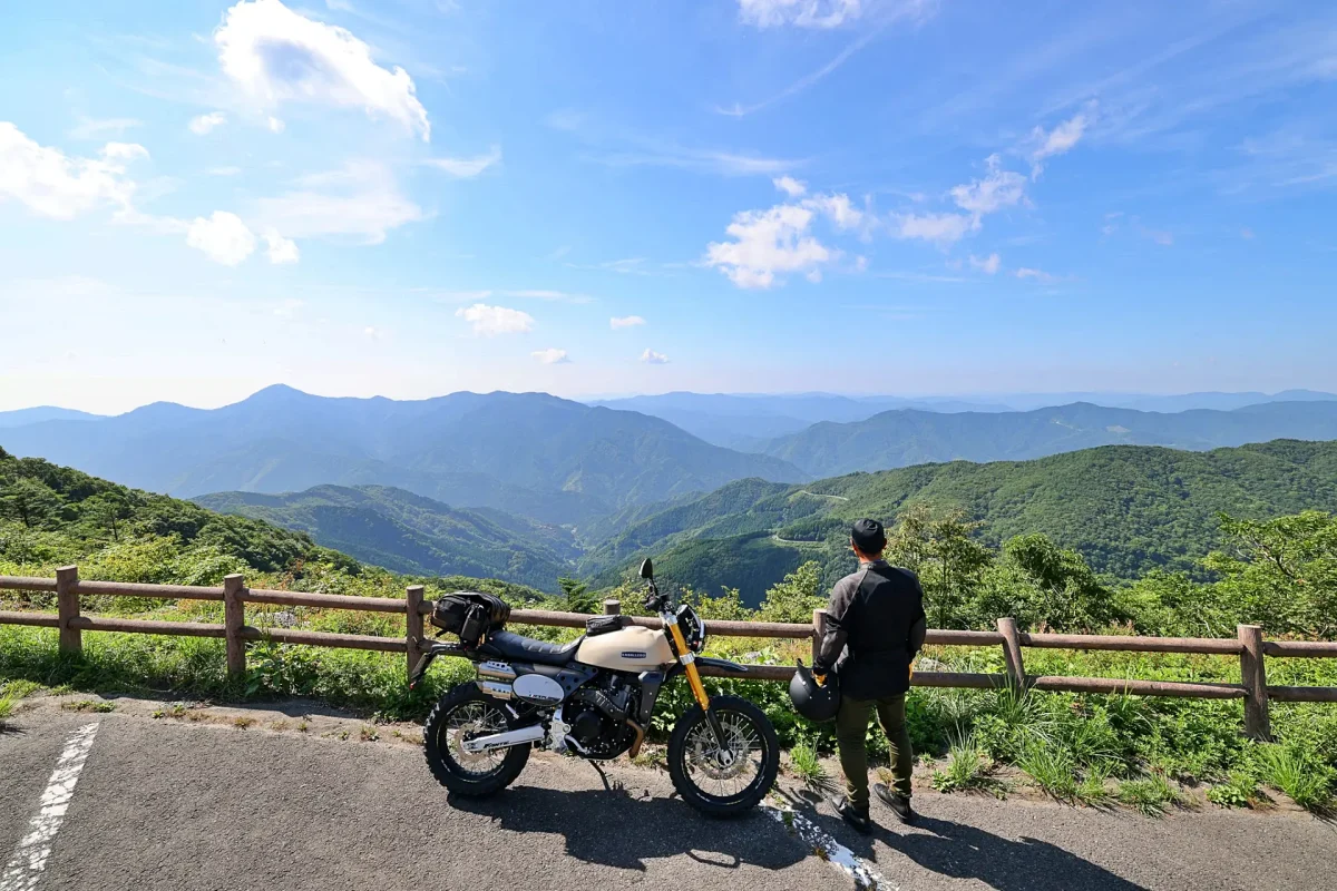 愛媛県と高知県の県境に跨る、標高1000m~1400mの「四国カルスト」の尾根沿いを走る県道383号。雄大な風景を見下ろすルートは狭い区間もあるが、ところどころにバイクが停めやすいスペースもあり、天上の爽快な景色を堪能できる。レストランでのランチも楽しめる「星降るヴィレッジTENGU」という宿泊施設があり、中間地点「五段城」付近の景観は特に素晴らしい。