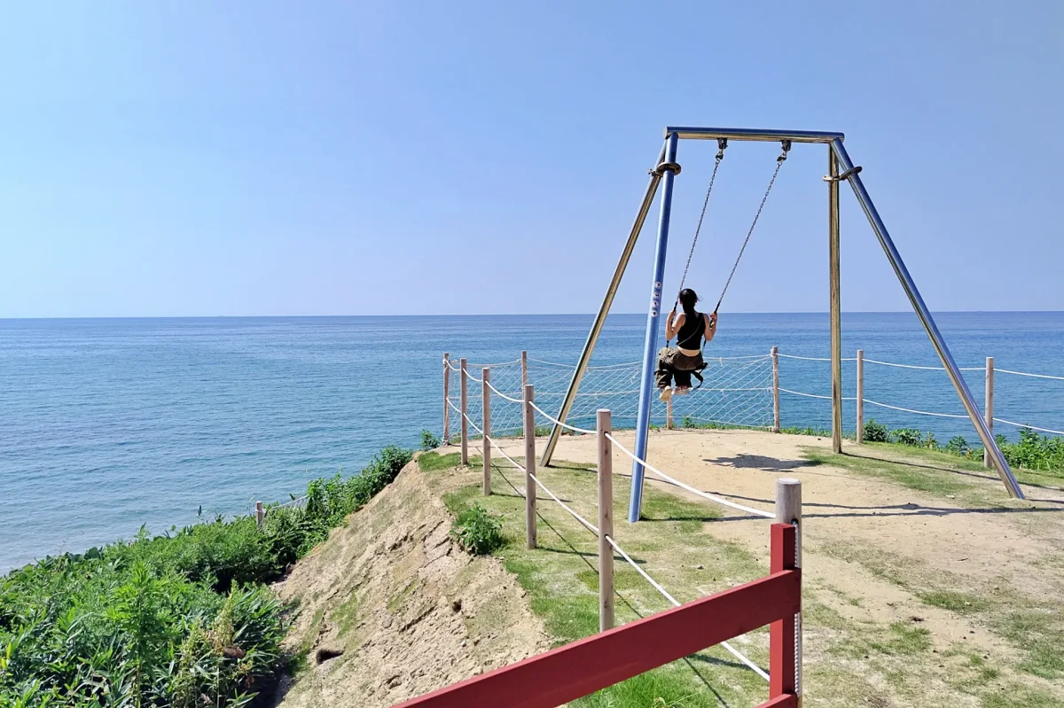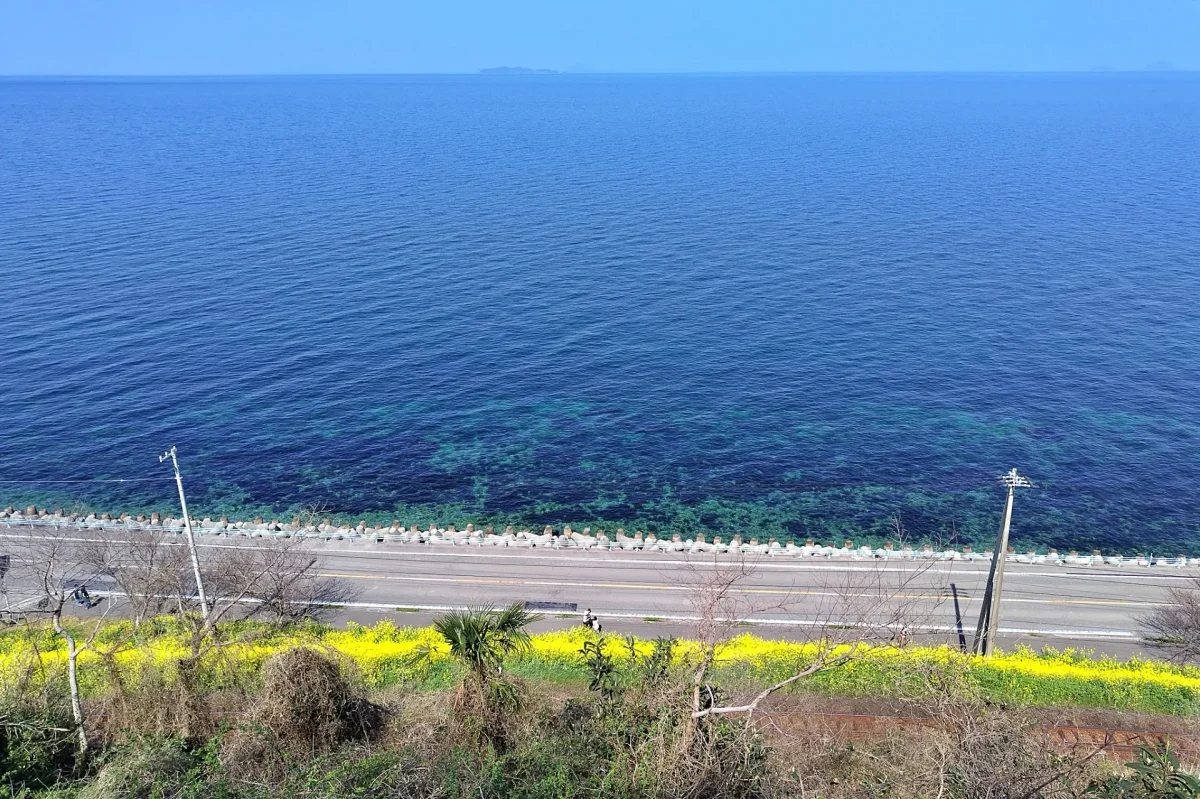 島根県中部出雲市の西部、「道の駅 キララ多伎」から出雲大社方面へと続く、気持ちの良い、日本海の海岸線を走る約11㎞の「くにびき海岸道路」。道の駅や「出雲・湖陵パーキングエリア」など景色に、食事も楽しめる施設も充実しています。中でも、「久村海岸公園」の駐車場はフェンスもガードレールもないので、海の風景はもちろん、夕日の時間もおすすめな絶好のフォトスポットです。