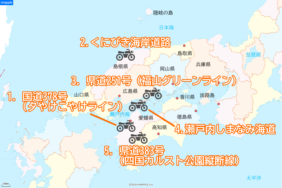 今回は、そんな場所に出会えるおすすめの「絶景道」を、『ツーリングマップル中国・四国』掲載エリアから、5ルート紹介します。早速見ていきましょう!