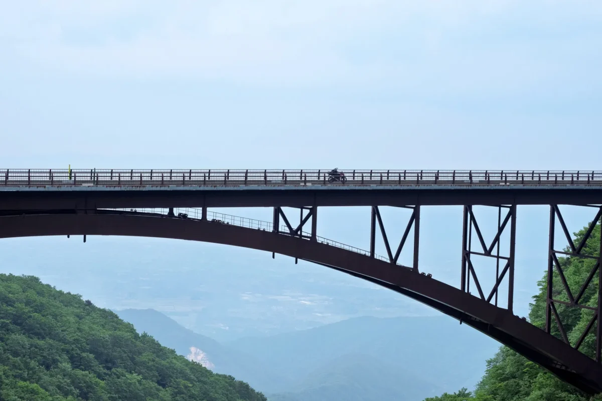 浄土平を出ると、すぐに荒涼とした岩場が広がる火山地帯で、さらに進むと「不動沢橋」です。目がくらみそうな深い渓谷にかかる、美しいアーチ橋で、眼下には福島の市街がちらりと見えました。