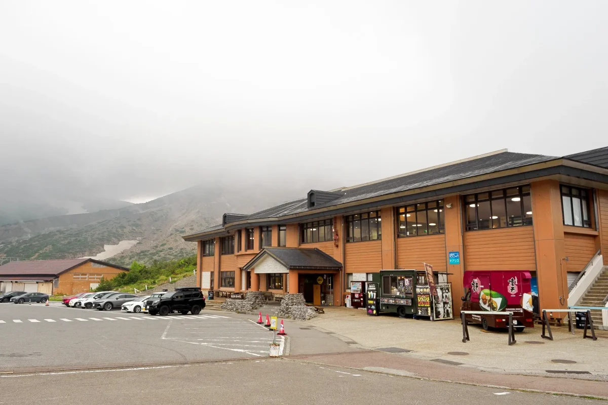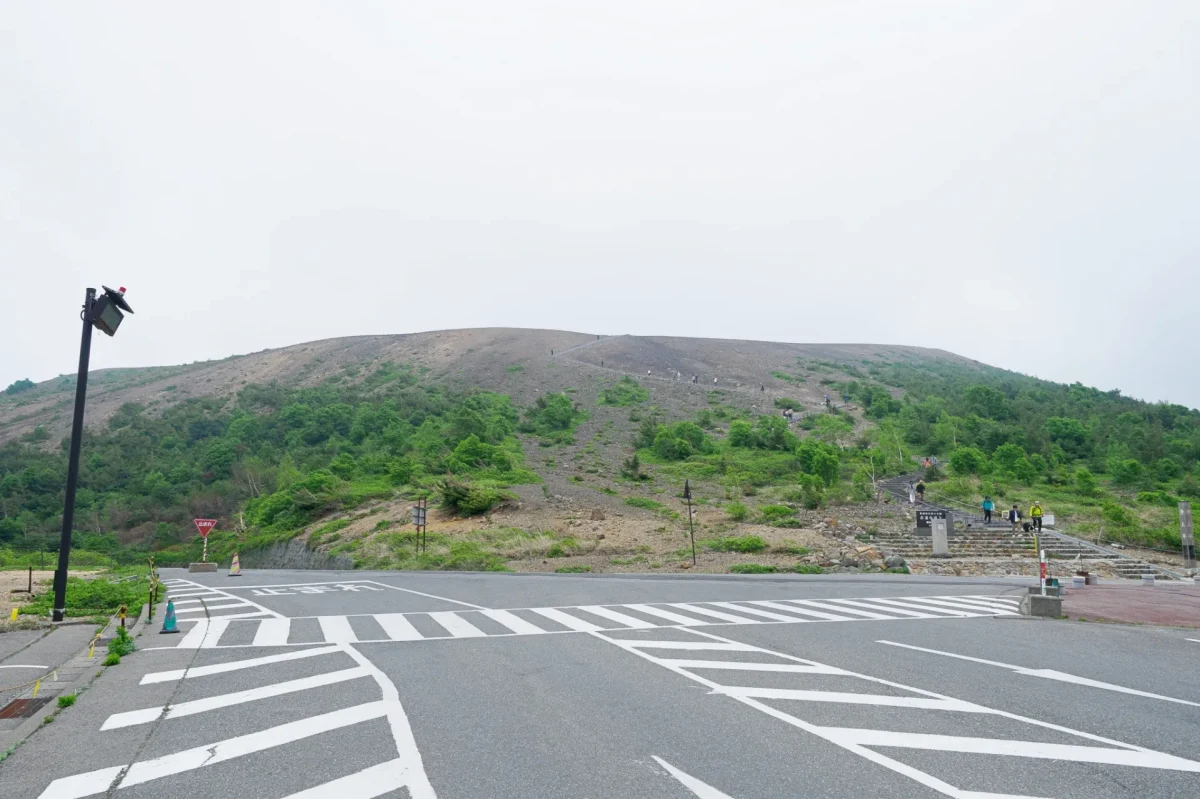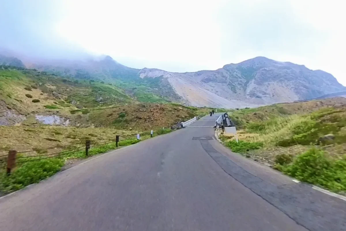 残念ながら、青空が消えて、雨が降り出しそうな天候になりましたが、標高が上がるにつれて、景観もダイナミックになっていって、森の向こうには雪が残る「安達太良山」も見えます。路面には標高がところどころに書いてあって、最高地点(1622m)が近づいていることを実感できます。
