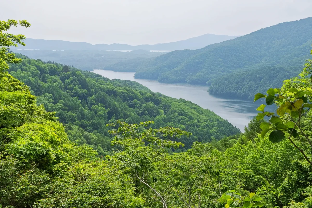 裏磐梯の剣ヶ峯地区まで戻って、磐梯吾妻レークラインへ入ります。小野川湖と秋元湖に挟まれた尾根の上を走る快走路で、裏磐梯の湖沼や森の景観が楽しめます。東側には「中津川渓谷」[ツーリングマップル東北 P.18(関東甲信越 P.103)K-2]があり、中津川橋から見下ろすこともできます。