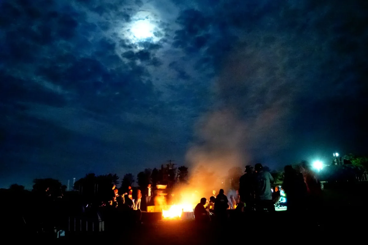 段々と日が暮れて、空に月も出てきた頃、焚き火がスタート。今年は、場所が変わってキャンプサイトから見えにくい場所だったんですが、それでも、一人二人と集まってきて、燃え上がる炎を見ながら、会話の輪が生まれていく、いつもの光景を見られました。