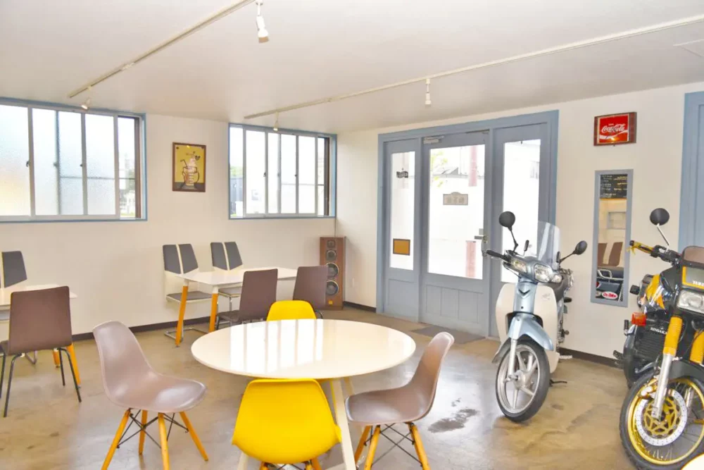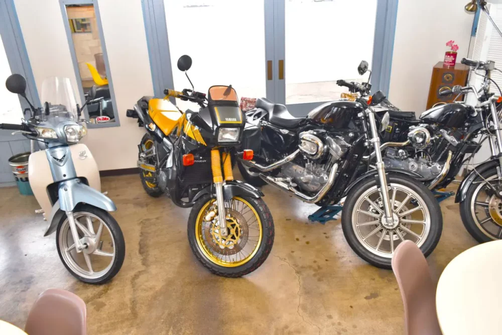 店内には、奥様のハーレーダビッドソンを含む4台のバイクが飾られています。白を基調とした店内は、スーパーカブをイメージしているそうです。