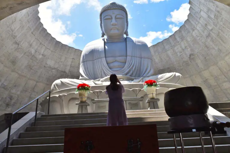 頭大仏は、高さ13.5m、総重量1,500t。57ものパーツから成り立っています。ドームの中では絵馬に願いを書き込んだり、おみくじを引いたりできます。絵馬に書かれているのは「宝くじが当たりますように」「彼氏が欲しい」「有名になりたい」など、煩悩のオンパレード。