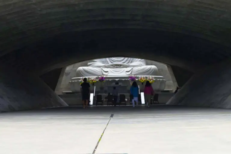 さらに進むと胎内を表現したトンネルが続き、大仏が少しずつ姿を現します。ドームにたどり着くと、天空から注ぐ光の中に鎮座する大仏の全貌が明らかに!