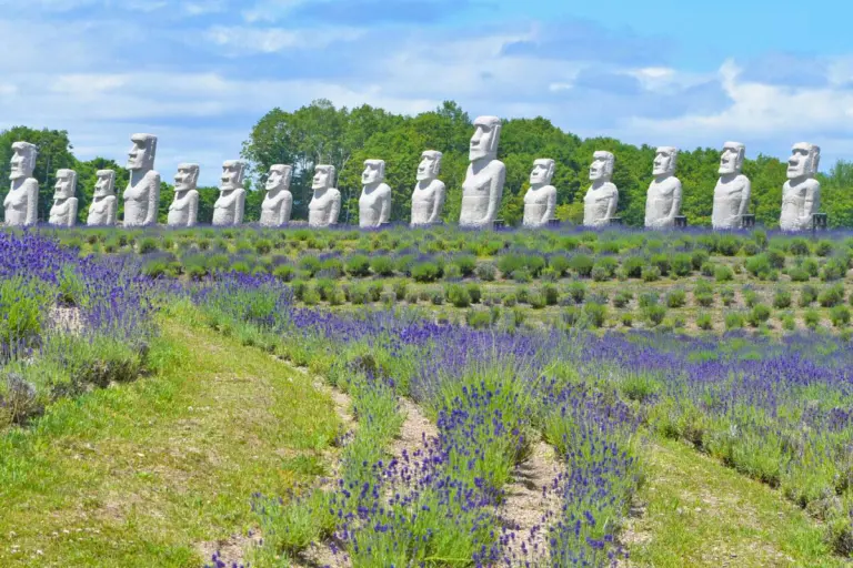 「富良野エリアに行かずに札幌近郊でラベンダーが見たい」というワガママな方におすすめなのが、ローカルライダーに人気のスポット「頭大仏」です。広大な霊園の敷地内には、丘の上に頭を突き出した大仏があり、そのまわりにラベンダーが咲き誇ります。さらにはイースター島にあるはずの巨大石像や、イギリスにあるべき巨大列石もある支離滅裂ぶり。美しく不思議な世界にご案内します。