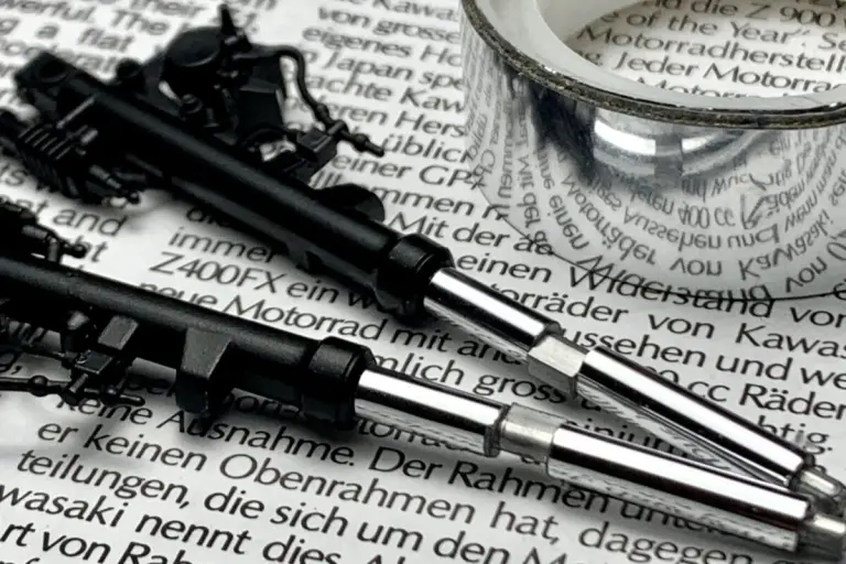 そのほかにも、ゴム質パーツの塗装にはクレオスの「タイヤブラック」を使用し、自然な使用感を表現。ブレーキディスクには墨入れを施し、細部まで抜かりない作業が随所に光ります。フォークのメッキ表現には100円ショップのメタル調テープを活用するなど、工夫も満載です。